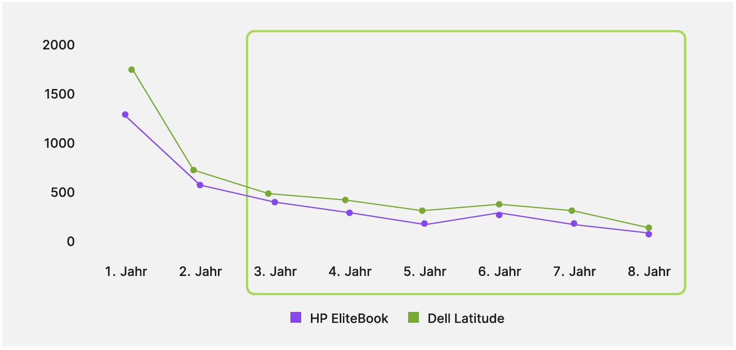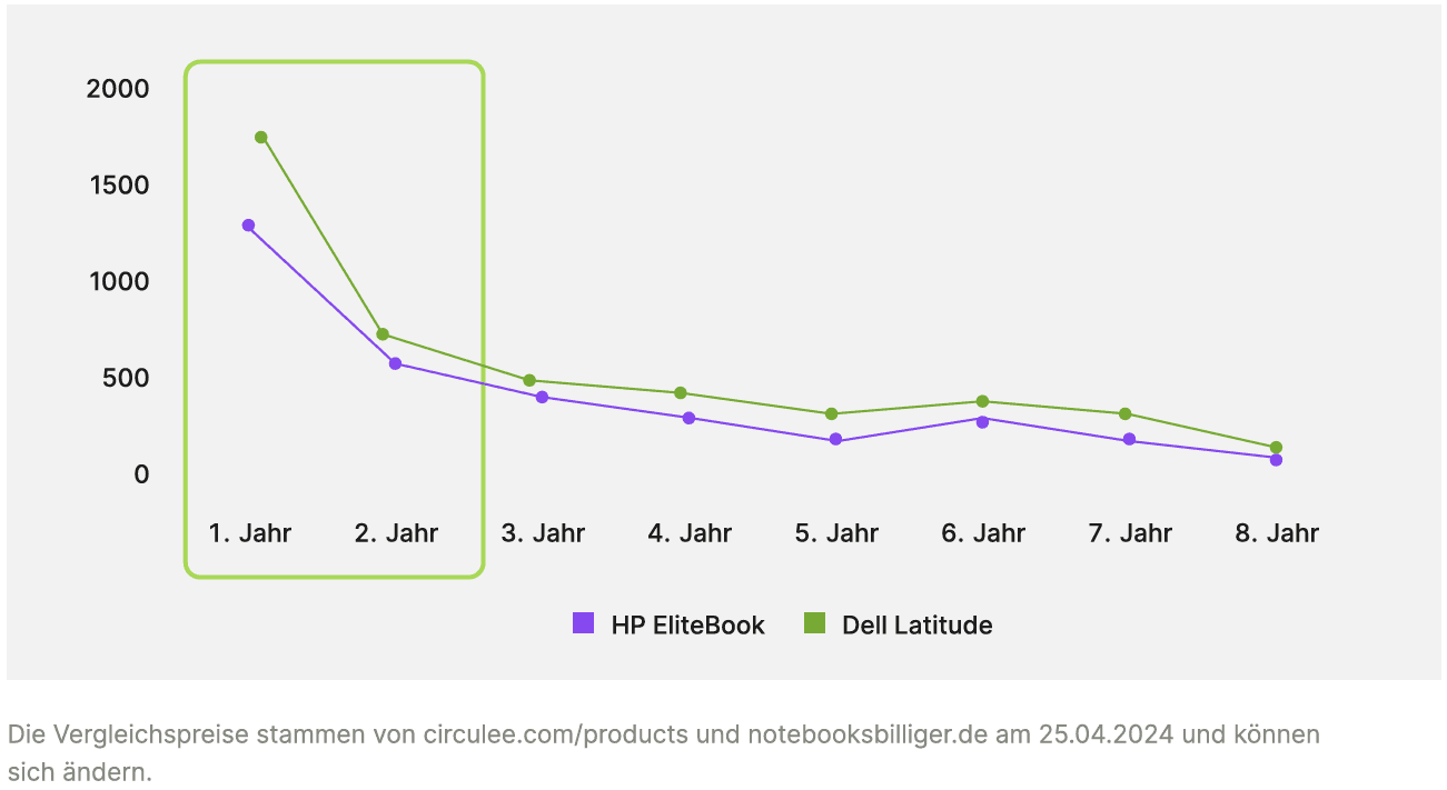 Der Marktwert gebrauchter IT-Hardware wird von verschiedenen Faktoren beeinflusst, darunter das Alter des Geräts, dessen Zustand, die technischen Spezifikationen/Fähigkeiten sowie die aktuelle Entwicklung des Neu- und Gebrauchtmarktes (Angebot und Nachfrage). Dabei ist der Fair Market Value (FMV), der Preis den ein potenzieller Käufer bereit wäre zu einem gegebenen Zeitpunkt zu zahlen. In der IT-Industrie wird dieser Wert in der Regel durch Auktionen, Marktanalysen, Vergleichspreise ähnlicher Produkte und den Zustand des jeweiligen Geräts ermittelt werden. Die folgende Grafik, basierend auf Marktdaten, zeigt die Entwicklung von den zwei Laptop Modellen Dell Latitude 7400 und HP EliteBook 840 G6. Wie bei Gebrauchtwaren üblich, fällt der Marktwert auch hier rapide innerhalb der ersten 3 Jahre der Nutzung.
